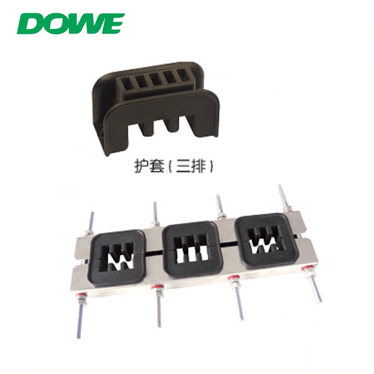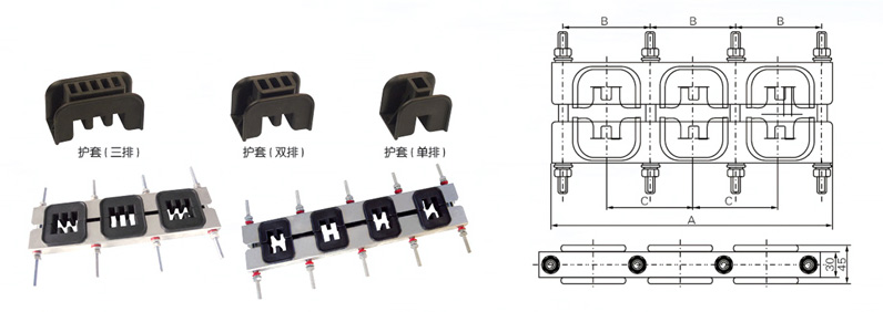 組合式護套母排夾由金屬支架、塑料護套、塑料墊圈等組成。塑料護套嵌入金屬支架內可用兩頭螺桿、上下螺帽調節銅排寬度尺寸,塑料墊圈可以防止母排電源磁場環行作用。